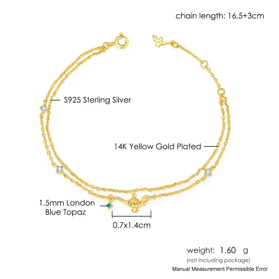 Elevate your everyday look with a touch of magic by pairing the Blue Topaz Magic Lamp Charm Bracelet with flowing silhouettes and soft hues, creating an ethereal ensemble that whispers tales of faraway lands and dreams come true.