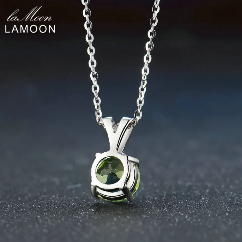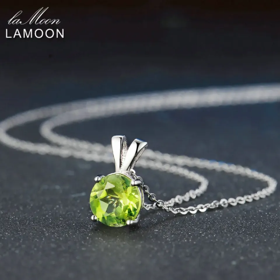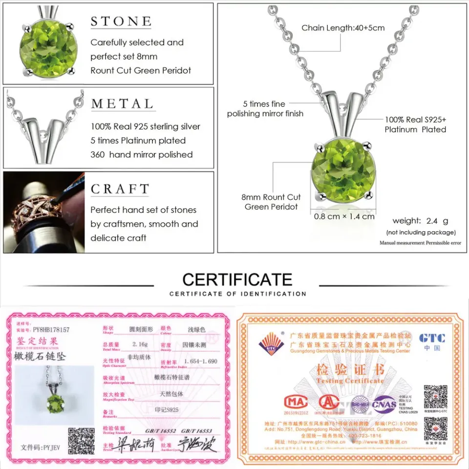 - Main Stone: At the heart of this pendant lies a captivating 8mm Round Cut Green Peridot, known for its bright, lively color and its association with harmony and health.