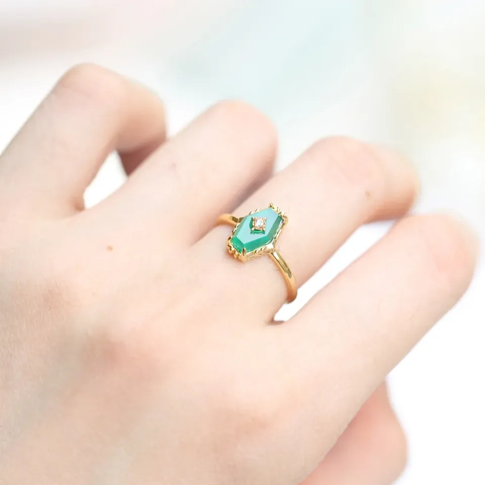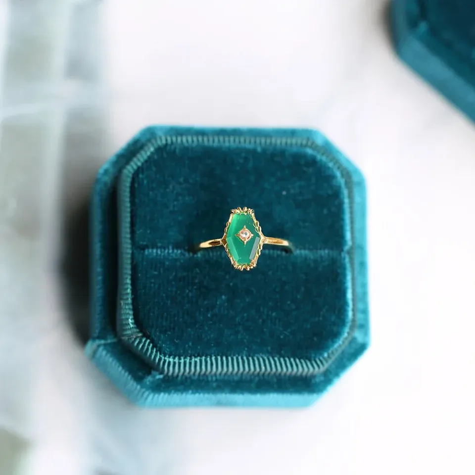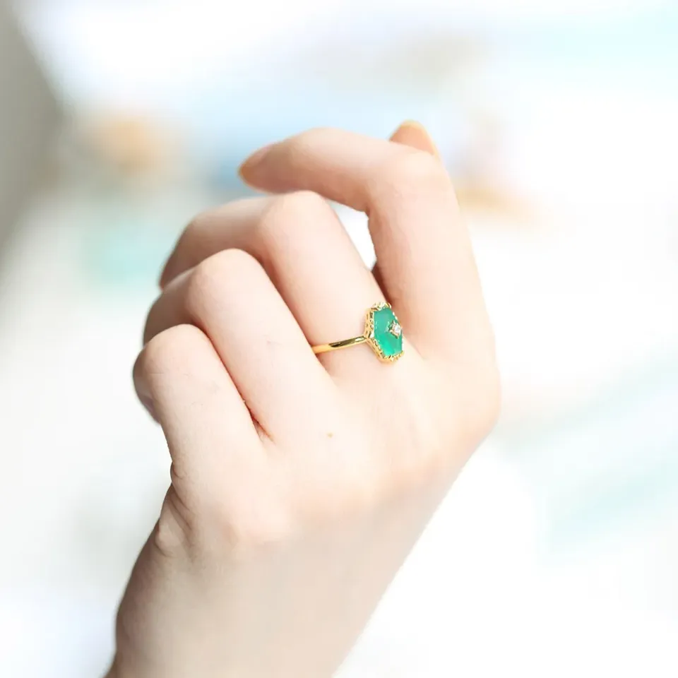 Inspired by the ancient belief in the healing powers of gemstones, La Moon’s Green Chalcedony Ring draws its essence from the nurturing spirit of the earth. The green chalcedony, known for its ability to foster goodwill and positivity, serves as the heart of this piece. This ring is a homage to the enduring human spirit, offering a touch of serenity and balance in the whirlwind of life. It’s a reminder of the beauty of self-care and the importance of maintaining harmony within.