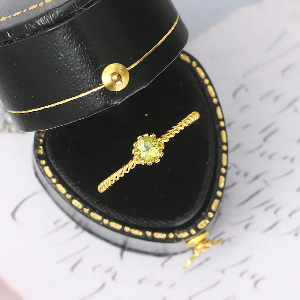 Accentuate your evening look with the Peridot Twist Korean Ring; its radiant green hue and twisted gold silhouette make it a striking companion to your little black dress, adding a splash of color and sophistication.