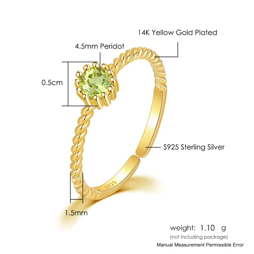 - Item Type: Peridot Twisted Ring, a unique design that combines the timeless beauty of Peridot with a contemporary twist, making it a versatile piece for any occasion.