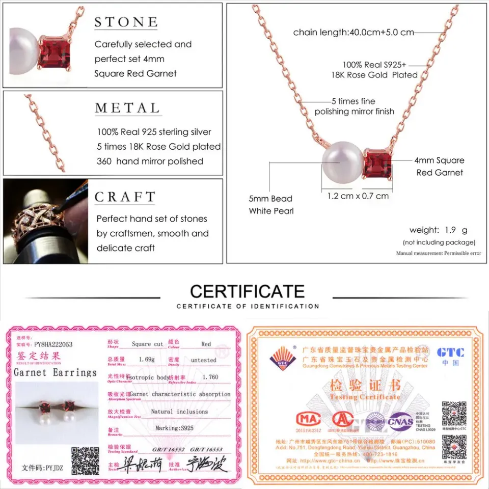 - Main Stones: Features a captivating Red Garnet, known for its deep, rich color that symbolizes love and heart’s desires, paired with the timeless elegance of Pearls, representing purity, fertility, and longevity.