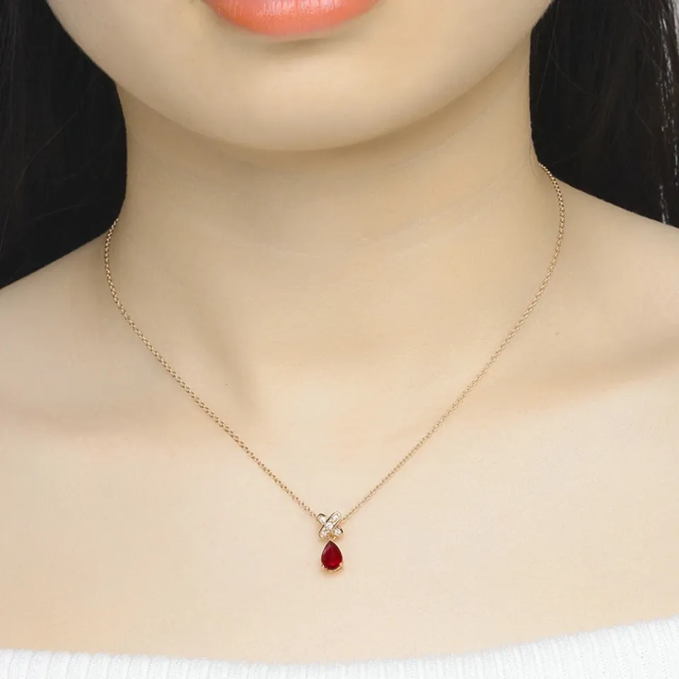 Elevate your evening ensemble by pairing the Ruby Water Drop Pendant with a simple black dress to let the deep red of the ruby take center stage, adding a touch of timeless elegance and allure to your outfit.