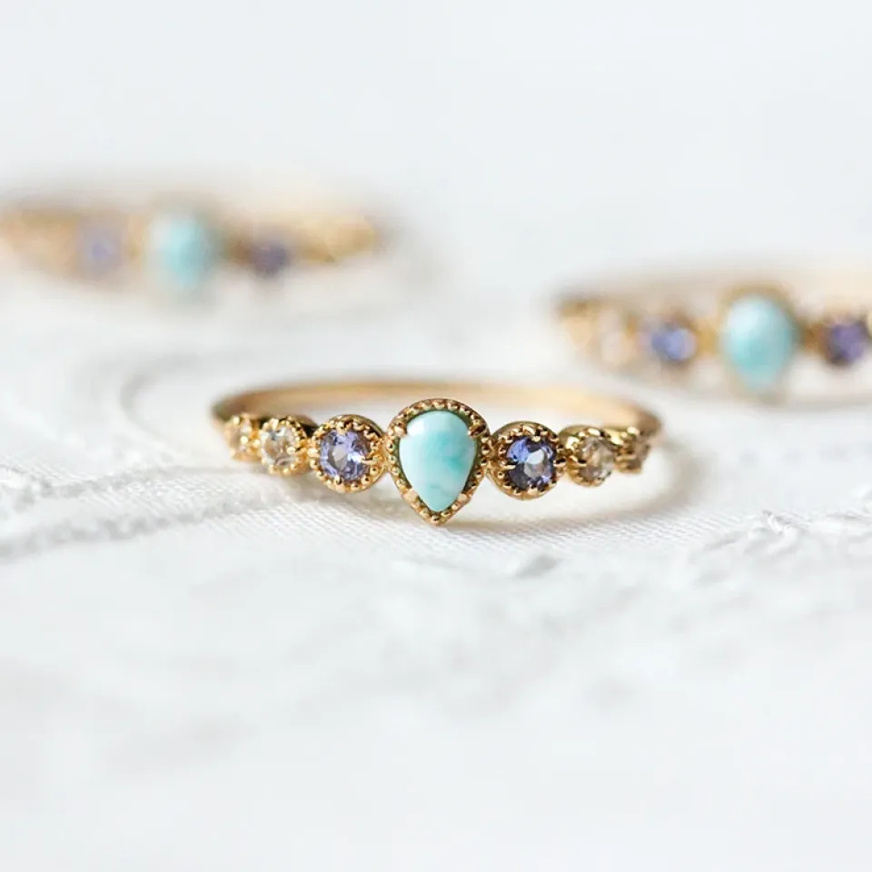 Inspired by the majestic beauty of the ocean and its underlying calm, the Sea Inspired Ring is a tribute to the depths of our planet’s waters. The selection of Larimar reflects the sea’s tranquil blues, Tanzanite’s hues echo the mystical depths, and White Topaz resembles the sparkling sunlight on the ocean surface. This piece is designed for those who carry the spirit of the sea within them, offering a piece of its timeless beauty and serenity.